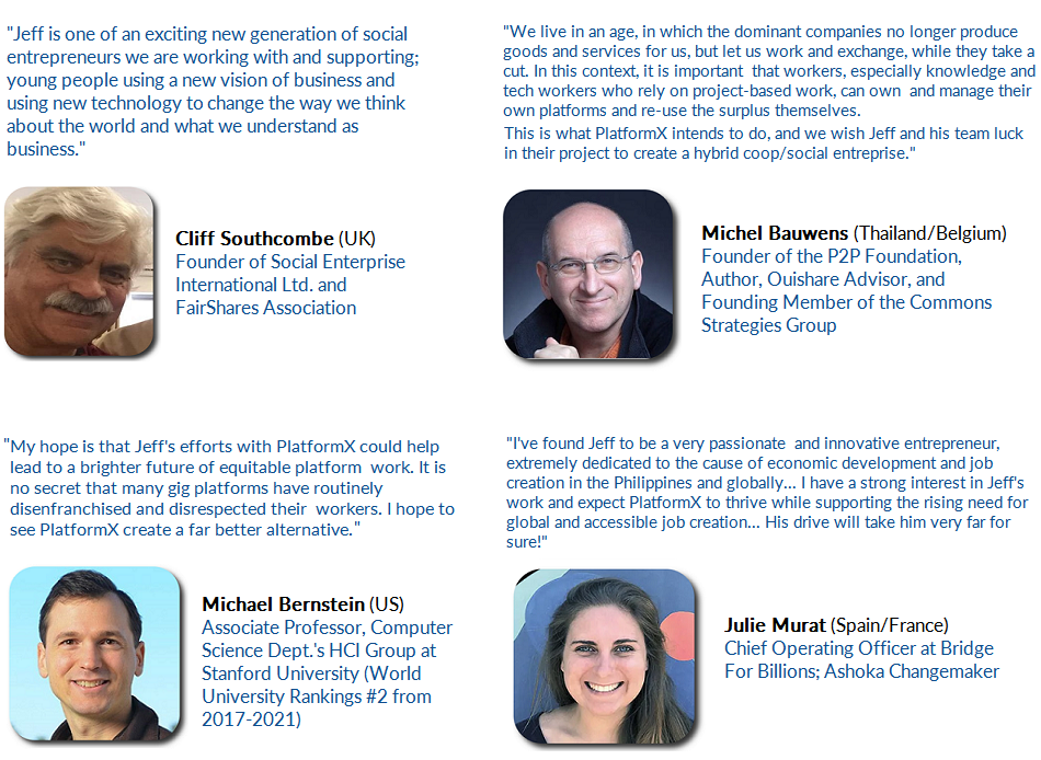 PlatformX has roots going back to 2013 and is building on various initiatives I’ve led and joined since 2014, including my website OnlineJobsPlus (through mentoring and volunteer-coaching over 4,000 online workers) and Stanford University’s Stanford Crowd Research Collective which I’ve joined for three years until 2018 (our published papers are listed here; search for “Jeff Regino”).